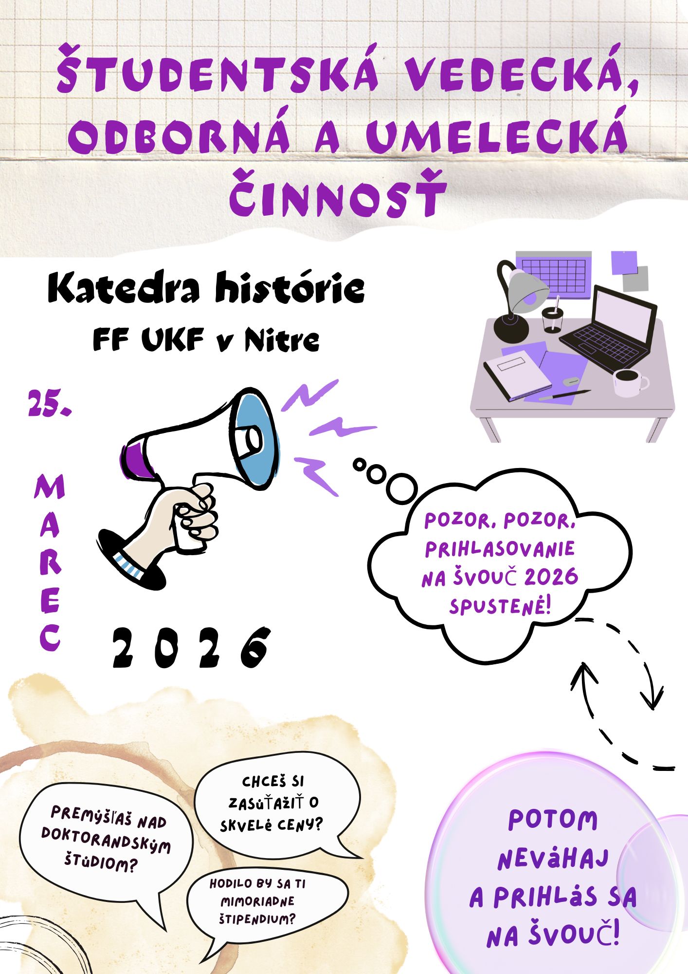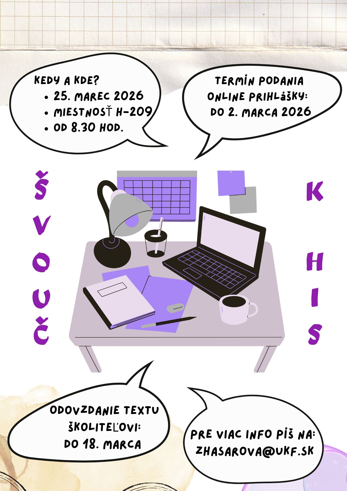 Ak rozmýšľaš nad doktorandským štúdiom, alebo  by sa ti zišlo mimoriadne štipendium, prípadne chceš len získať skúsenosti s prezentáciou, prihlás sa na katedrové kolo ŠVOUČ. Konať sa bude dňa 25. marca 2025 od 8.30 hod. v miestnosti H-209 na Hodžovej ulici. Prihlás sa online do 2. marca a do 18. marca odovzdaj svoju prácu školiteľovi. Môžeš získať skvelé ceny. Viac informácií na zhasarova@ukf.sk .