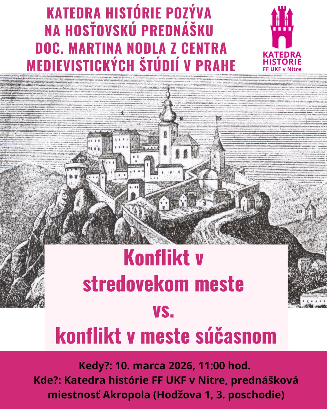 Dňa 10. marca 2026 v Akropole (miestnosť H-307), so začiatkom o 11:00 hod. sa bude konať prednáška Martina Nodla, významného českého historika pôsobiaceho v Centre medievistických štúdií v Prahe. Podujatie organizuje Katedra histórie FF UKF. Všetci ste srdečne
